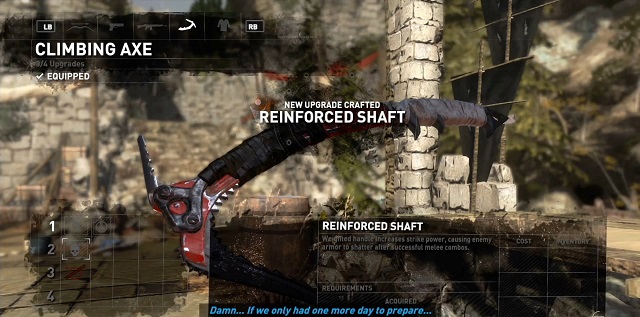 Az összegyűjtött pontok, tárgyak, alkatrészek lehetőséget adnak, hogy fejleszteni tudjuk képességeinket, fegyvereinket. Ezek azonban az előző részekhez mérve csak a táborhelyeken tudjuk végre hajtani. Itt is három részre oszlik a fejleszthetőségi faktor. Első körben vannak a tulajdonságaink, ahol a túlélési, harci, vagy a taktikai képességeinket növelhetjük. Három szint van mindegyiknél, s ha összegezve nézzük nagyon sok lehetőség van, hogy mit is fejlesszünk. Első nekifutásnál nyilván ésszerű azokat fejleszteni, amire valóban szükségünk van. Például hiába leszünk pisztoly szakértű, mellyel a szóban forgó fegyvert összes tulajdonsága a miénk, ha éppenséggel azt az eszközt nem használjuk. A felszerelésre nagyobb hangsúly tevődik, hiszen folyamatos fejlesztése nem elhanyagolható, hiszen nem mindegy, hogy mennyi lőszert tudunk magunkkal vinni, vagy mi az, amit tárolni tudunk a hátitáskában, mely továbbra is úgy működik, mint ha egy nagy fekete lyuk lenne benne a tárgyak mennyiségét illetően. Fegyverekből ismét sokat kapunk, s négy aktuálissal rendelkezünk, melyből hármat tudunk váltogatni, de ezeket is csak a táborhelynél. Így ha menet közben elfogyott a lőszer, akkor bizony marad a közelharc. Bár tény, hogy legtöbbször az íj az, amit megéri használni.